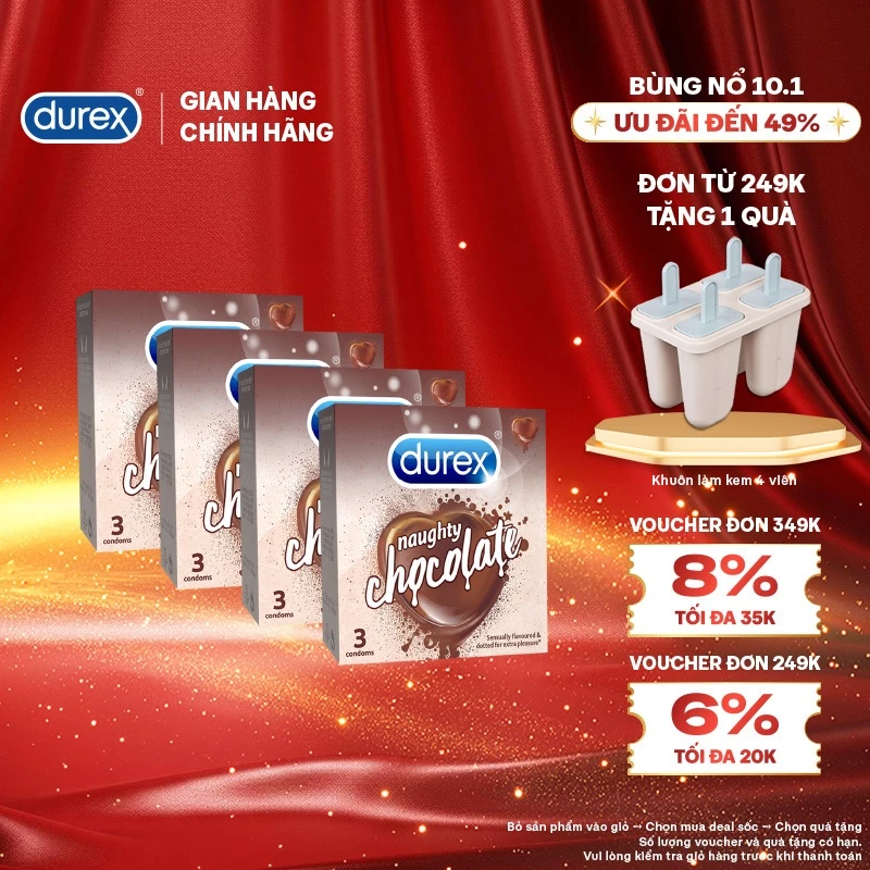 Khám phá ngay Bộ 4 hộp Durex Naughty Chocolate hương socola (size 53mm, 3 bao/hộp) để làm mới và thăng hoa đời sống tình dục của bạn!