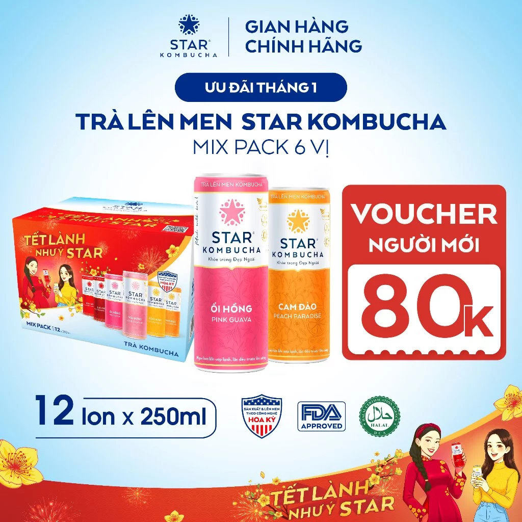 Thùng 12 lon trà lên men Star Kombucha mix vị Tết (250ml/lon) – Trà lên men vi sinh hỗ trợ tiêu hóa, bảo vệ sức khỏe